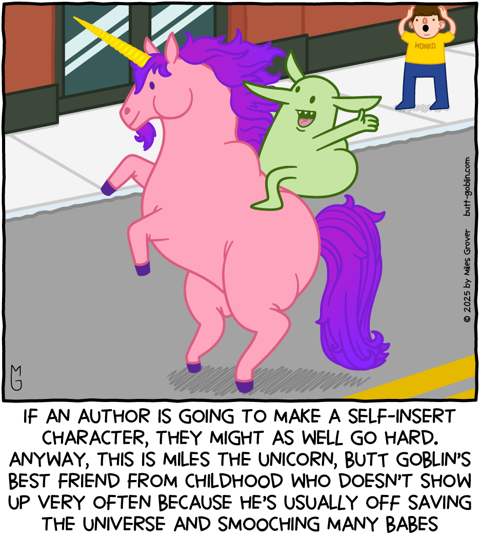 Transcript: If an author is going to make a self-insert character, they might as well go hard. Anyway, this is Miles the unicorn, Butt Goblin’s best friend from childhood who doesn’t show up very often because he’s usually off saving the universe and smooching many babes